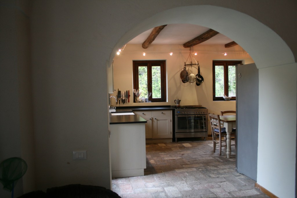 There is a lovely big, well equipped kitchen with access to a river facing terrace. There is a washing up machine and there are two fridges (one is very handy for just drinks). There is also an adjoining larder for storage.